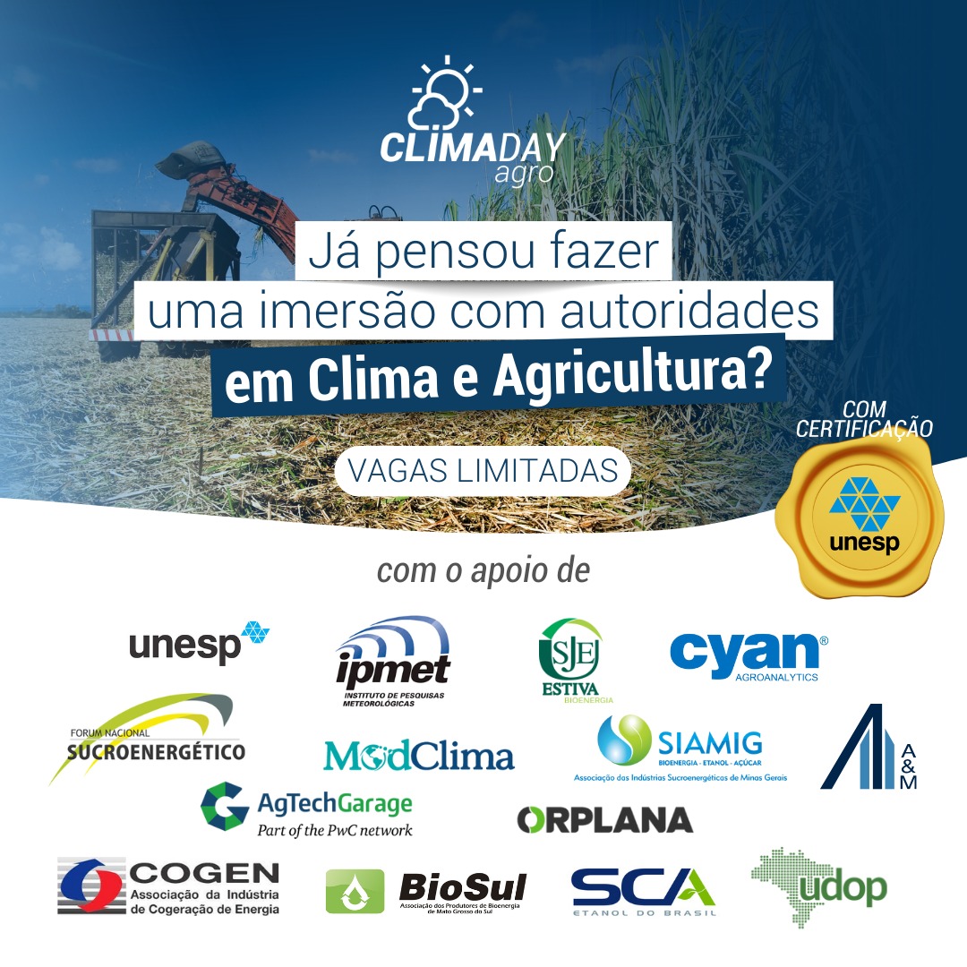 No próximo dia 20 de março, das 8h às 17h, acontecerá a primeira edição do evento CLIMADAY Agro, promovido pela CYAN Agroanalytics, empresa que atua na área de pesquisas climáticas aplicadas, focadas na indução, quantificação e medição de impactos da variável chuva, voltadas ao setor hídrico e agronegócio, com o apoio de outras instituições, entre elas a UNESP.